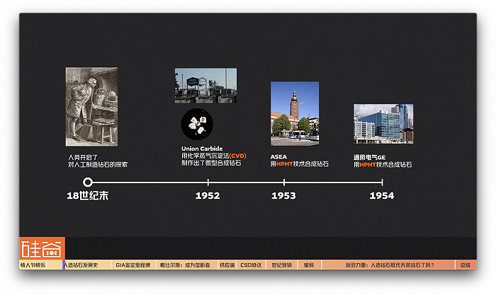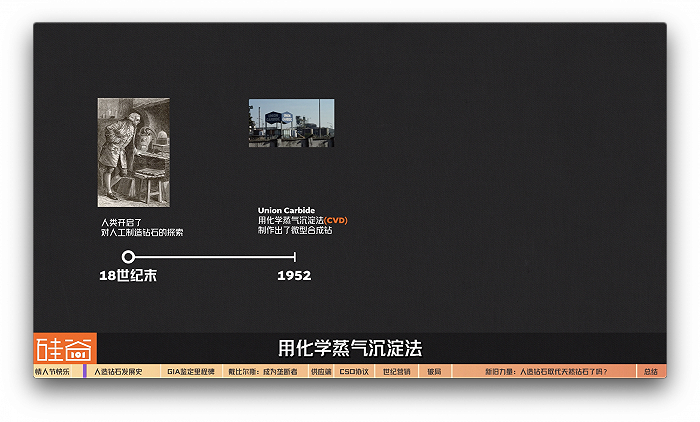 1952 年,美国石油化工公司Union Carbide用化学蒸气沉淀法chemical vapour deposition,简称CVD,在低压及相对较低的温度条件下制作出了微型合成钻石。