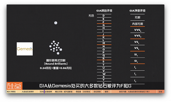 而美国宝石研究院GIA的研究人员嗅到了市场的风声,立马从Gemesis公司购买了16 颗钻石,开始进行鉴定。他们发现,其中15颗钻石采取了圆形明亮式(round brilliants )切割,重量从 0.24 克拉到0.86 克拉不等,大多数接近无色。在GIA对钻石的4C评级上,颜色评级从D到Z,D是最接近无色的,GIA从Gemesis处买的大多数钻石被评为F和G,相当不错的成色了,其中三颗被评为I和J,而最大的一颗0.9克拉的方形切割(rectangle cut)钻石被评为L级。而在净度上,基本所有买来的钻石都在较高级VVS或VS的级别,其中有一颗达到了“内部无暇”的顶级净度。