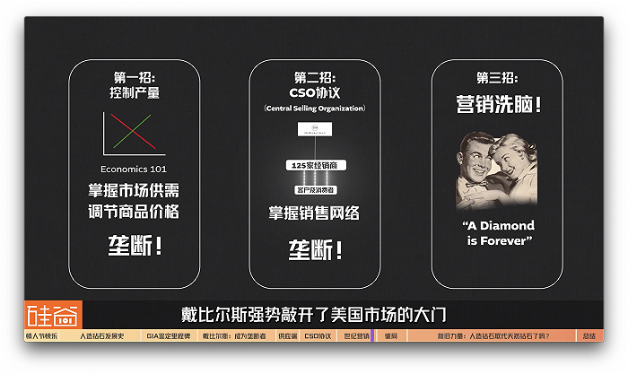 大萧条期间谁会想买钻石对吧?而面对疲软的需求市场和节节下跌的价格,奥本海默想了三个狠招,奠定了戴比尔斯此后几十年的高枕无忧的持续垄断钻石帝国的地位:
