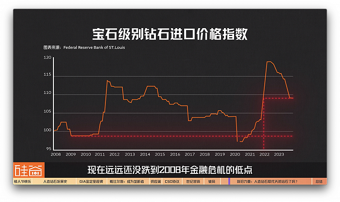 但是我们再回到圣路易斯联储的这张宝石级别钻石进口价格指数上,然后把时间轴拉长一点,会发现,目前的钻石价格的跌幅不过是跌到了2021年的12月。如果再拉长会发现,现在远远还没跌到2008年金融危机的低点。我们对此也采访了追踪钻石市场多年的国际分析师,他认为,目前天然钻石的降幅主要是对2020年到2021年期间钻石价格快速上涨的修正。当时疫情期间,因为国际供应链问题,出现了钻石短缺,导致价格迅速飙升。