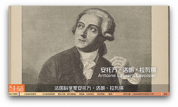 钻石在人类社会中被视为瑰宝和珍贵的象征已经数千年,但直到1772,被称为“现代化学之父”的法国科学家安托万·洛朗·拉瓦锡 (Antoine Laurent Lavoisier)将一颗钻石放入充满氧气的密闭罐中,用巨大的放大镜聚焦太阳光线将它燃烧,结果发现钻石和碳一样,每克材料会形成相同量的二氧化碳,由此人类意识到,钻石是由碳元素组成的矿物。