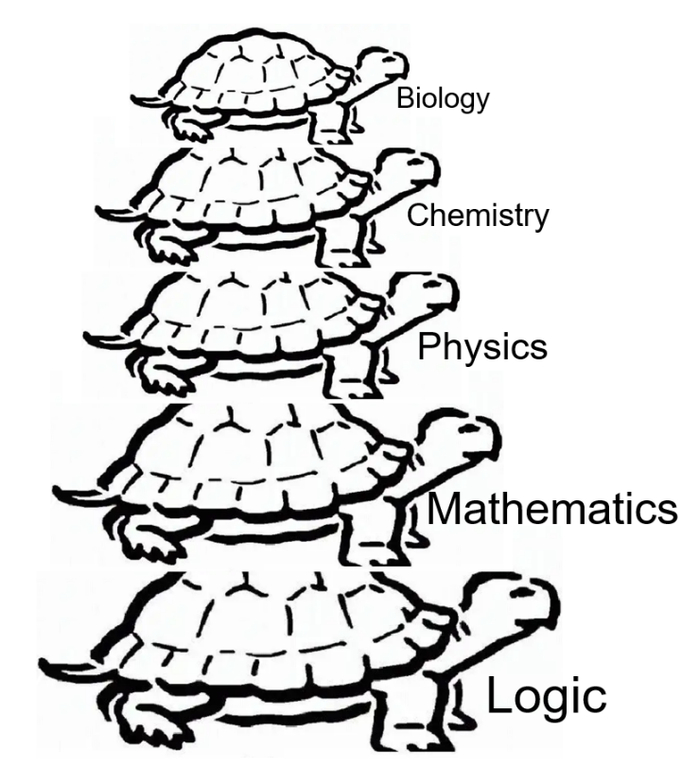 王浩在论及不同学科的形式化vs直觉时,把学科按照形式化程度依次排列为心理学、生物学、化学、物理学、数学和计算。越往后,形式化程度越高,这里计算包含了逻辑。这种分法也不算独特,纸质《大英百科全书》第十五版的目录卷Propedia就把学科按照如此分类,在心理学类还有社会科学等等。这种层层依靠的分类方法在西方的话语中一直就有,知识越发达,分类就越细。物理学家霍金在《时间简史》中说,罗素曾经在一次天文学的科普讲座上被一位老太太教训:“世界哪儿有那么复杂,就是一个放在乌龟背上的平板。”罗素反问:“那乌龟站在什么上面呢?”老太太答:“小伙子,你挺聪明,乌龟下面是更大的乌龟,一路乌龟啊(turtles all the way down)!”我们可以借用这个说法,最底层的乌龟就是逻辑,逻辑上面是数学,数学上面是物理,物理上面是化学,化学上面是生物,生物上面是心理,如此类推。这种说法其实就是粗颗粒度的还原论。下面为上面设置了边界并且提供工具,上面为下面提供需求。有些新学科可能脚踩几条船,例如计算机科学,可能其中软件会更踏实地踩在数学上,而硬件踩在物理上,计算理论则可能来源于逻辑。由罗素传开的“层层王八”的说法就是把学科和数学以及数理逻辑的远近程度排了个序,离数学和逻辑近的,形式化程度就高。