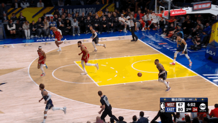 除了多项得分纪录被打破,今年全明星的“三分雨”势头更加猛烈。在双方球员均不设防的总基调下,两队总计尝试了168次三分球,命中67球,以利拉德、哈利伯顿、杰伦·布朗为代表,东部队三分球97投42中,一举打破了全明星三分球总投篮次数、总命中次数以及单队投篮次数、命中次数的纪录。