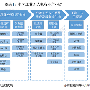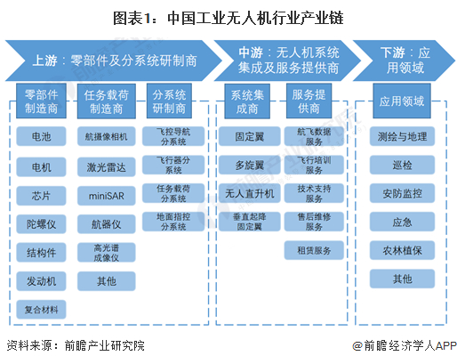 工业无人机行业上游为无人机零部件制造商及分系统研制商;中游为无人机系统集成及服务提供商,部分能够提供无人机航飞服务、飞行培训服务等,在产业链中占据主导地位;下游主要以测绘与地理信息、巡检、安防监控、应急等领域的用户为主。