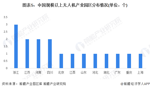 目前,我国针对无人机设立的相关产业园暂不多,据前瞻产业园区库不完全统计,我国规模以上的无人机产业园区共有17个,主要分布在浙江、江苏等地,其中浙江共有3个。