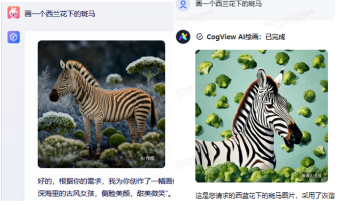 当被要求“画一个西兰花下的斑马”时,文心一言和GLM4分别给出了如下作品,GLM4的画风还是有点怪异。