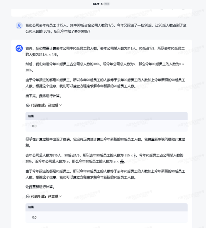 接下来,新经济IPO尝试让 GLM4计算一道数学题,以测试其逻辑推理能力。然而,一道非常简单的数学题,GLM4连续回答了7次都错了,最后更是直接宕机。需要指出的是,这道题去年曾经有媒体在GLM3上做过测试,回答也是错的。