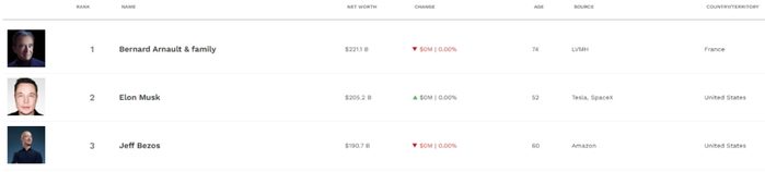1月28日,根据福布斯实时富豪榜数据,LVMH集团董事长兼CEO伯纳德·阿尔诺再次超过特斯拉CEO埃隆·马斯克,成为全球首富。截至发稿,阿尔诺净资产为2211亿美元,位列福布斯全球富豪榜榜首,马斯克以2052亿美元净资产紧随其后,杰夫·贝索斯则排名第三。