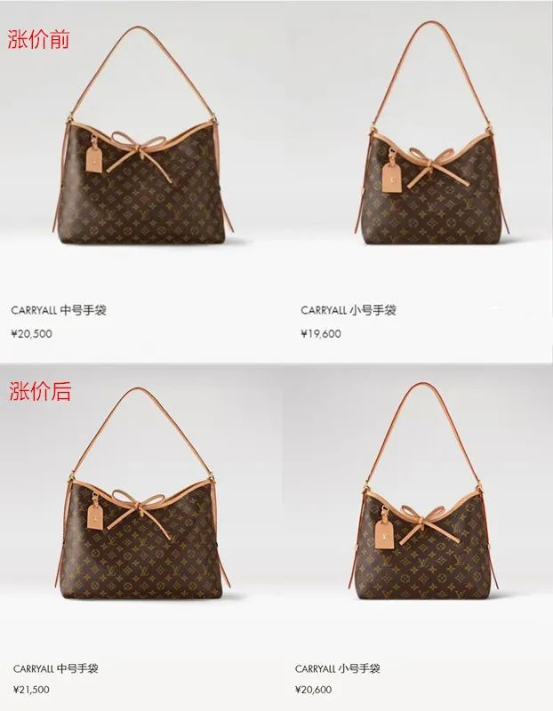 据中国证券报报道,LV官方客服人员表示,目前,LV部分产品确实有调整,线上及线下均同步更新。更新后Carryall小号手袋从人民币19600元涨至20600元,涨幅5.1%,Carryall中号手袋从20500元涨至21500元,涨幅4.8%。其他品类产品也有不同程度的上涨,具体以官方售价为准。