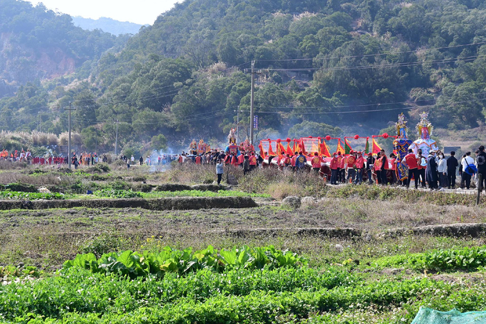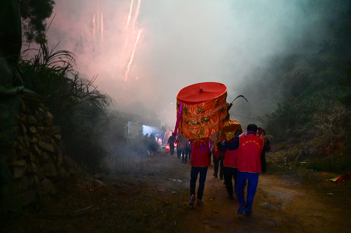 2024年2月17日,福州市长乐区岱灵村。抬着神明的人们走在乡间小路上。