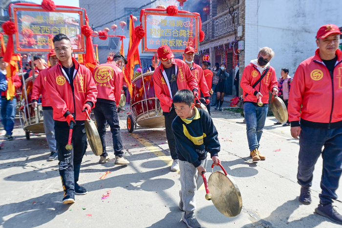 2024年2月17日,福州市长乐区岱灵村。一位“10后”男孩走在游神鼓板队前头敲锣。