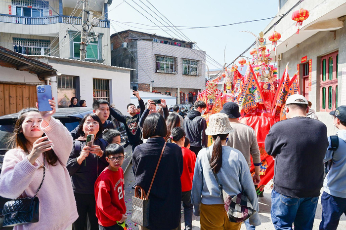 2024年2月17日,福州市长乐区岱灵村。当地的游神活动吸引了各地游客前来体验。