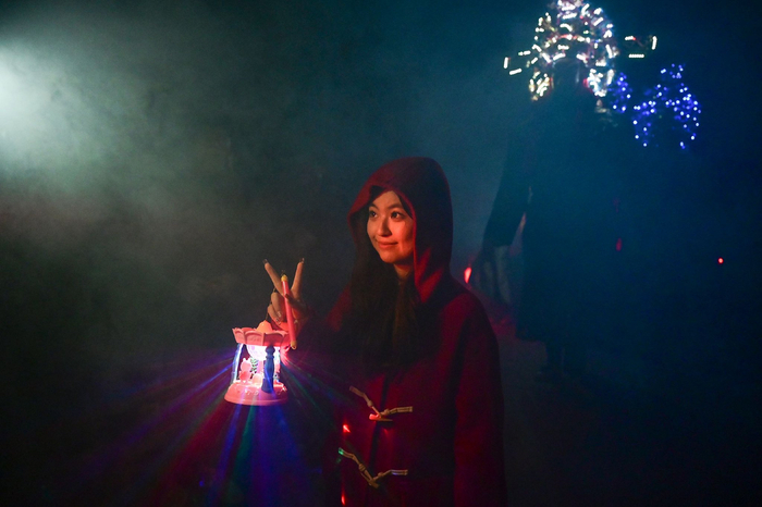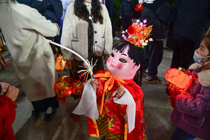 2024年2月17日,福州市长乐区岱灵村。晚上村里的游灯活动吸引前来体验游神的人们打卡拍照。