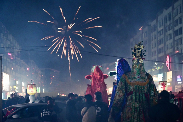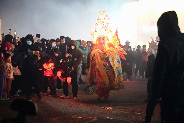 2024年2月17日,福州市长乐区岱灵村。晚上村里的游灯活动花炮震天。