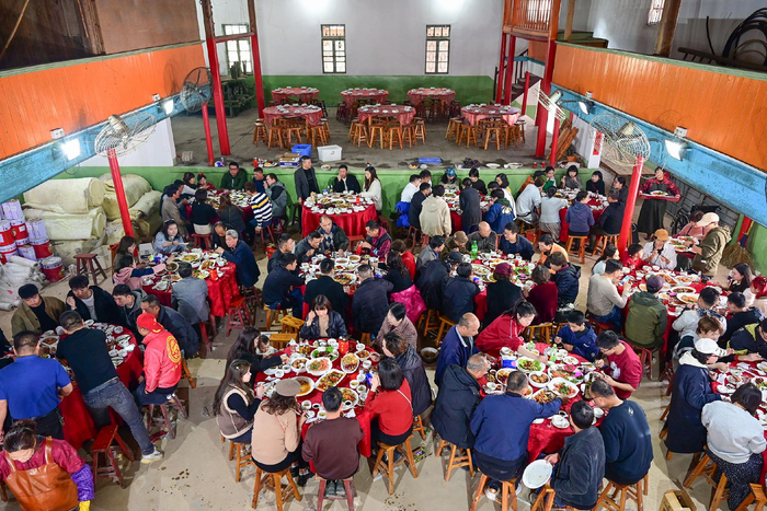 2024年2月17日,福州市长乐区岱灵村。叶女士在叶氏旧祠堂摆设家宴。