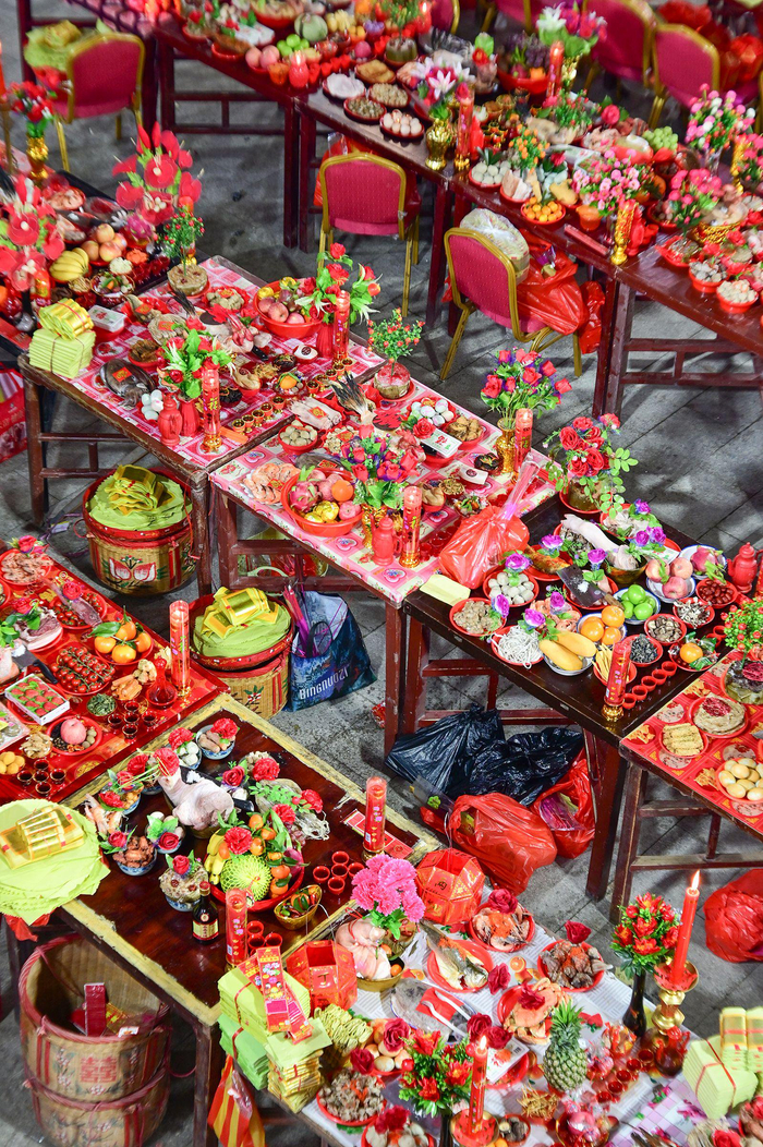 2024年2月17日,福州市长乐区岱灵村。叶氏祖厅里摆放着的贡品。