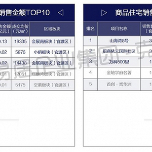 从“双榜”情况来看,受备案滞后影响,合计仅有5个项目上榜。其中,山海湾8号、招商依云国际社区、万科500里3 个项目位列前三,成交均价分别为19335元/㎡、5876元/㎡、14438元/㎡。金地学府名著、首创·誉华洲2个项目也榜上有名,均有1套房源成交。