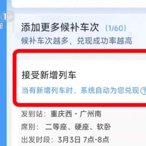 国铁兰州局兰州西客站售票员贾梦丹介绍,打开铁路12306App,在首页输入自己想要的乘车区间和乘车日期后,点击查询车票,在想要购买的车次下方,点击候补,在旅客规划的时间段内,选择的车次越多,候补购票成功率会相应变大。添加好候补车次后,在右下角点击候补下单,点击下一步就跳转至确认候补订单界面,旅客需要添加乘车人,通过自主选择是否接受新增列车、无座及设置候补订单截止兑换时间等选项的方式,进一步提高候补购票成功率。