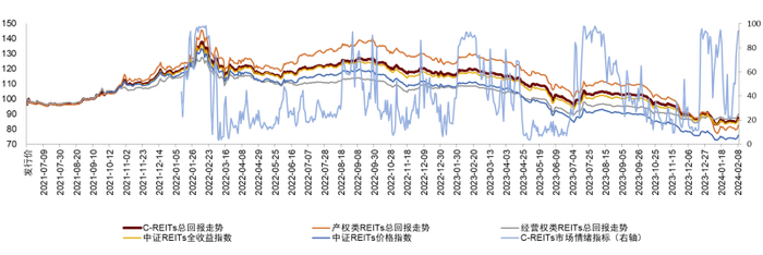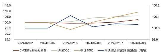 注:1)为方便对比,我们对中证REITs价格指数及全收益指数进行了起始日期标准化处理;2)各REITs纳入C-REITs总回报计算的时间点:建信中关村REIT与华夏越秀高速REIT于2021年12月22日收盘纳入;华夏中国交建REIT于2022年5月6日纳入;国金中国铁建REIT于2022年7月15日纳入;鹏华深圳能源REIT于2022年7月29日纳入;红土深圳安居REIT、中金厦门安居REIT及华夏北京保障房REIT于2022年9月9日纳入;华夏合肥高新REIT于2022年10月13日纳入;国泰君安临港创新产业园REIT及国泰君安东久新经济REIT于2022年10月21日纳入;华泰江苏交控REIT于2022年11月18日纳入;中金安徽交控REIT于2022年11月25日纳入;华夏基金华润有巢REIT于2022年12月16日纳入;华夏和达高科REIT于2022年12月30日纳入,嘉实京东仓储基础设施REIT于2023年2月17日纳入,中信建投国家电投新能源REIT和中航京能光伏REIT于2023年4月7日纳入;中金湖北科投光谷REIT于2023年7月7日纳入;中金山东高速REIT于2023年11月3日纳入;国泰君安城投宽庭保租房REIT于2024年1月19日纳入;3)数据截至2024年2月8日