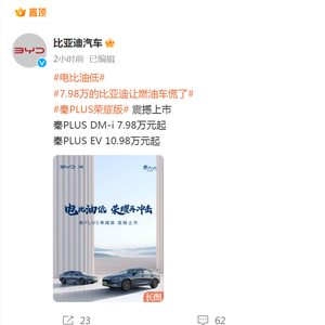 比亚迪汽车官博发文表示,电比油低,比亚迪出“王炸”,秦PLUS驱逐舰05,7.98万起插混双雄荣耀出击。