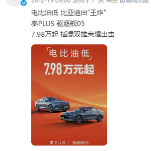 2月19日,比亚迪对外宣布,秦PLUS DM-i荣耀版、驱逐舰05荣耀版以低于同级别燃油车价格上市,起售价均为7.98万元,全面冲击A级家轿市场。“2024年,比亚迪不再对合资燃油车‘手下留情’。”比亚迪方面表示。