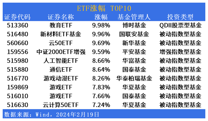 ETF市场日报(2月19日):全面开花,多主题ETF涨超8%,这只T+1基金换手率超500%