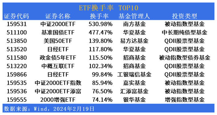 换手率方面,中证2000ETF(159531.SZ)换手率达530.98%。