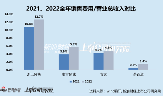 在毛利率不占优的情况下,公司的期间费用率远高于其他递表的3家企业也进一步拉低了公司的赚钱效应。2021年、2022年,沪上阿姨的销售费用占营业总收入的比例分别为10.9%、12.7%,远高于其他三家递表新式茶饮企业。