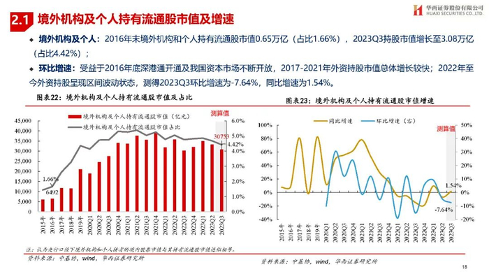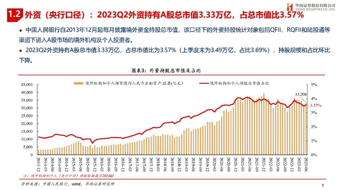 二、央行口径下,外资二季度末持有A股总市值3.33万亿,占A股总市值的3.57%2023Q2境外机构和个人持有A股总市值3.33万亿(占比3.57%),环比-4.61%,同比-6.84%。测算三季度持股规模,2023Q3外资持有A股流通市值约3.08万亿元,占A股流通市值的4.42%(前值4.67%),占自由流通市值的8.36%