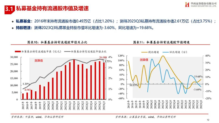 三、三季度末私募基金持有流通股市值2.61万亿,规模仅次于公募和外资。经测算,截至2023Q3,私募证券投资基金持有流通股市值2.61万亿,环比-3.60%,同比+19.68%。私募机构持有的股票规模在专业机构投资者中位列第三,仅次于公募和外资,占A股流通市值和自由流通市值比重分别为3.75%7.09%