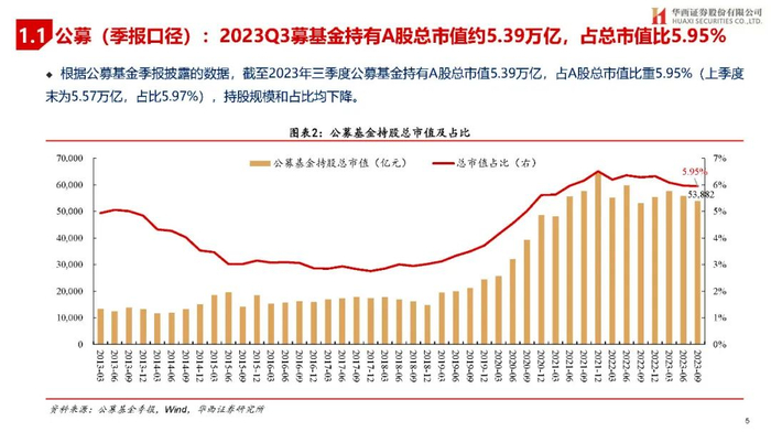 一、公募基金三季度末持有A股总市值5.39万亿,占A股流通市值的7.74%截至2023Q3,公募基金持有A股总市值5.39万亿,占A股总市值比重5.95%(上季度末为5.57万亿,占比5.97%),持股规模环比-3.28%,同比+1.50%。公募基金是持股比重最高的机构投资者,在A股流通市值、自由流通市值中分别占比7.74%、14.65%