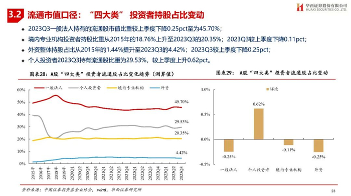 五、个人投资者流通股持股占比依然较高(29.53%)。根据测算,流通市值口径下,截止2023Q3,一般法人持股占比最高,为45.70%;个人投资者次之,为29.53%;境内专业机构投资者合计持股市值占比为20.35%
