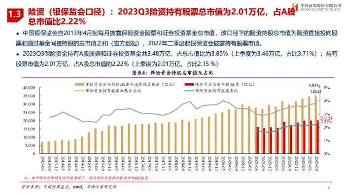 四、三季度末保险资金持有流通股规模分别为2.01万亿,占A股流通市值的2.89%总市值口径下,2023年三季度末保险资金持有A股股票和证券投资基金共3.48万亿,占总市值比为3.85%(上季度为3.46万亿,占比3.71%);假定险资持有股票均为流通A股,Q3保险机构持有股票2.01万亿,占A股流通市值和自由流通市值的比重分别为2.89%5.47%