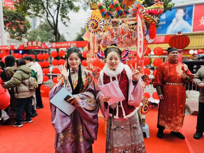 穿梭于人群中的古装卖货郎,一人一车一面拨浪鼓,叫卖声瞬间把人带回了旧时繁华;老街小巷的美食集市上,人们为了尝一口地道小吃而欣然等待;花灯摇曳、“珠翠满头”的龙灯车走街串巷,将满载的“星光”散入烟火人间;货郎车巡游、汉服巡演、舞龙舞狮、非遗技艺展演等新春活动,让游客们驻足拍照,乐此不疲……