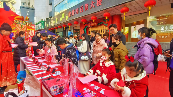 老商圈“潮”起来,新商圈在复古。春节期间,一场“迎新春文化年货大集”在银泰百货蚌埠店举行。集市摊位上摆满了琳琅满目的年货,其中巨型零食大礼包更是凭借霸气十足的规格和喜庆热闹的包装吸引过往市民视线。卫调花鼓戏《小姑贤》、泗州戏《小二姐做梦》……民间剧团轮番上演精彩剧目,对联、福字……书法家即兴创作。逛市集、买年货……丰富有趣的体验为市集增添了浓浓的年味儿。