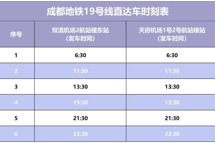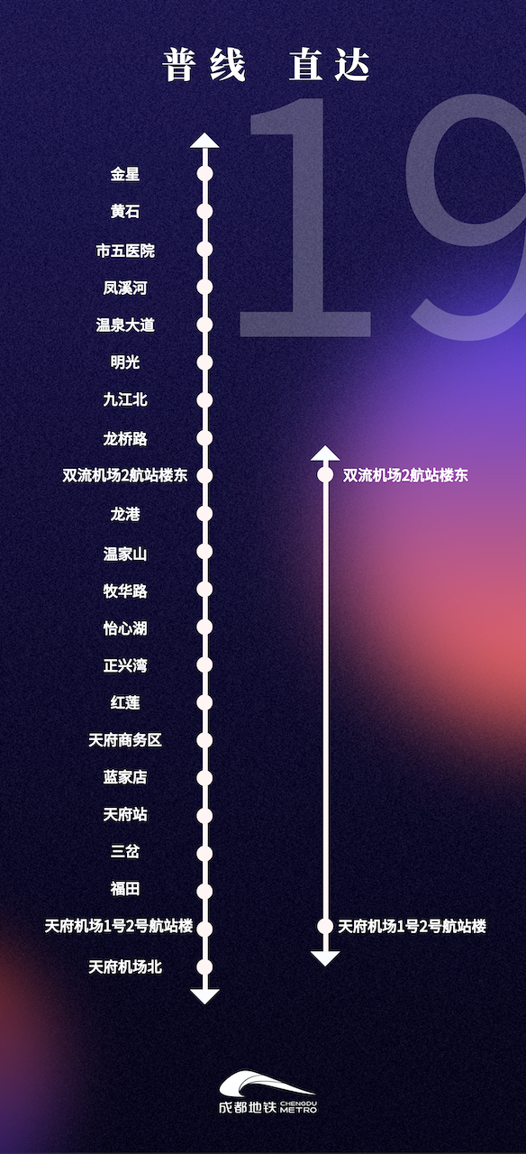 为切实提升旅客在成都双机场之间出行的通达性和快捷性,成都地铁19号线开启“共线运营”新模式兼顾市域快线和机场干线复合功能。若您航班时间充裕,可乘坐普线,全程不到1小时即可悠哉游哉,欣赏沿途美景轻松抵达天府机场;若航班时间紧急,您可乘坐仅停靠双流机场2航站楼东站和天府机场1号2号航站楼站的直达线,全程约30分钟就能一键直达天府机场,便捷高效。