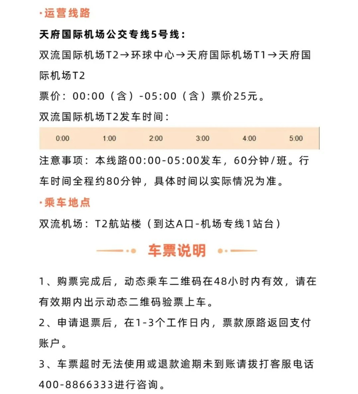 夜间00:00-05:00的机场专线服务弥补了凌晨公共交通的运力不足,诠释了双流机场“两场畅转,无忧出行”的真情服务,体现了综合交通的互补优势,满足您不同时段的出行需求。
