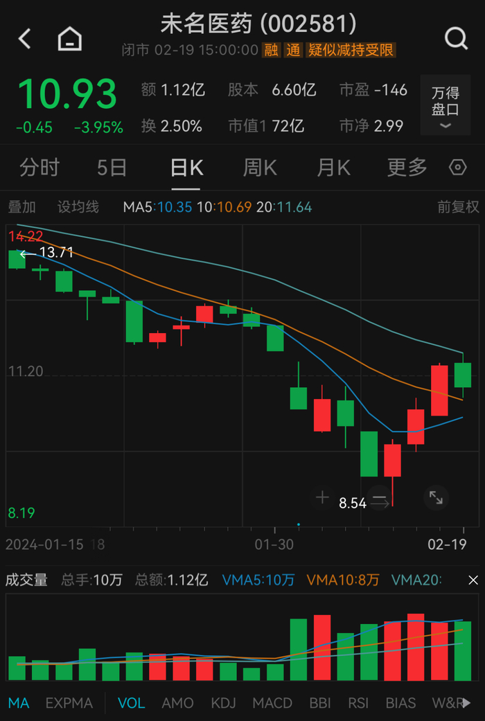 截至2月19日收盘,未名医药每股报10.93元,2月以来涨幅超4%,最新市值72亿元。