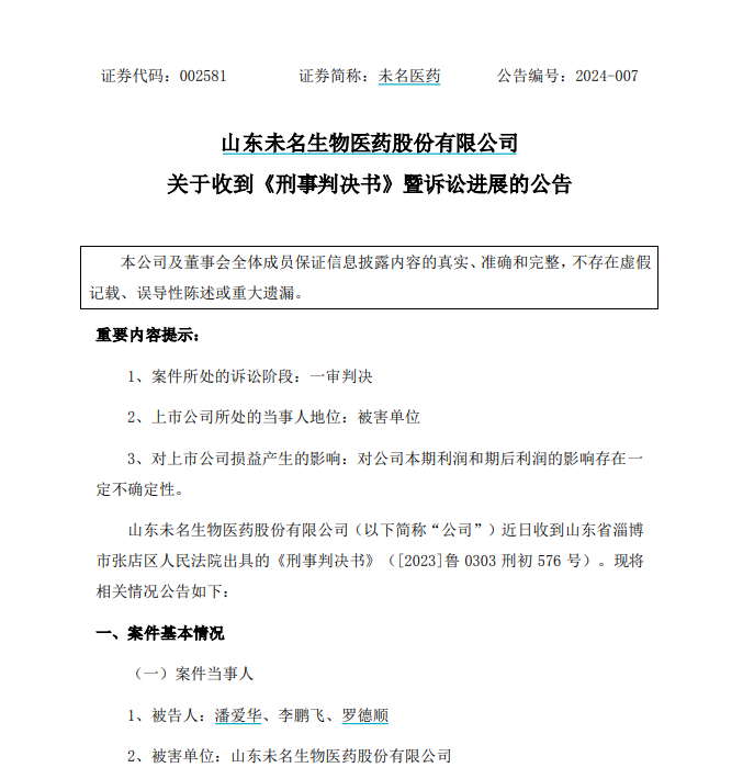 根据公司于2月19日发布的公告,未名医药于近日收到山东省淄博市张店区人民法院出具的刑事判决书。