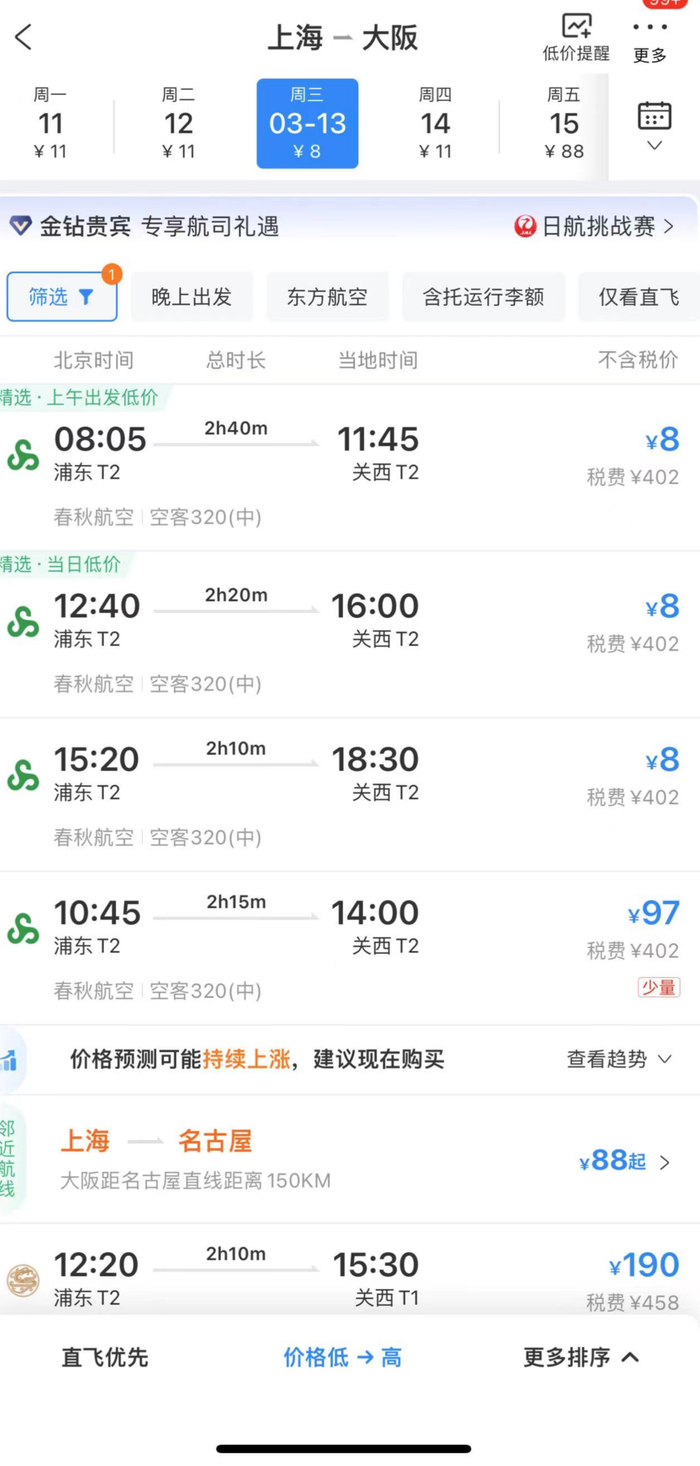 3月中旬上海飞日本大阪,机票最低只要8元!税费402元