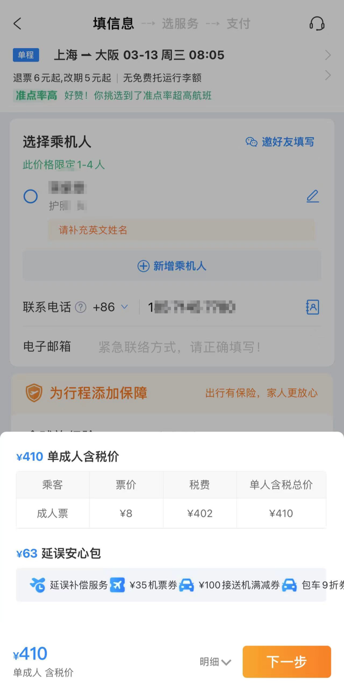 红星资本局在携程APP发现,8-11元的价格属于不含税价,可以选择的出发日期从2月下旬至3月中旬。以3月13日的机票为例,当日多趟航班的成人票价均仅需8元,加上402元税费后,单人含税总价为410元。3月13日前后几天的票价也仅需11元,加上税费后为400多元。