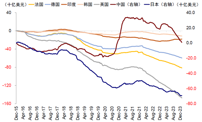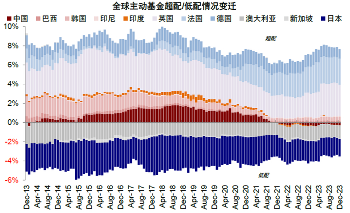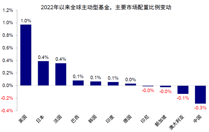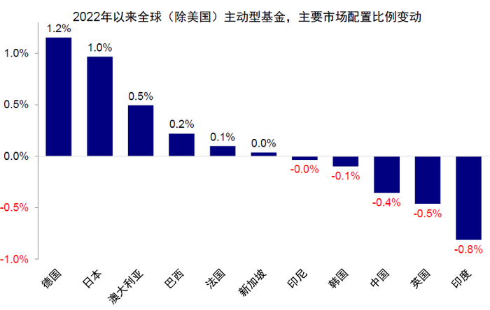 图表15:2022年以来,全球基金对日本、韩国与印度增配,英国与日本增配幅度最大;中国减配较多