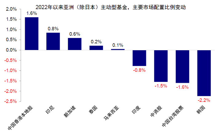 图表21:2022年以来,对中资股低配比例加深,对韩国相对减配较多