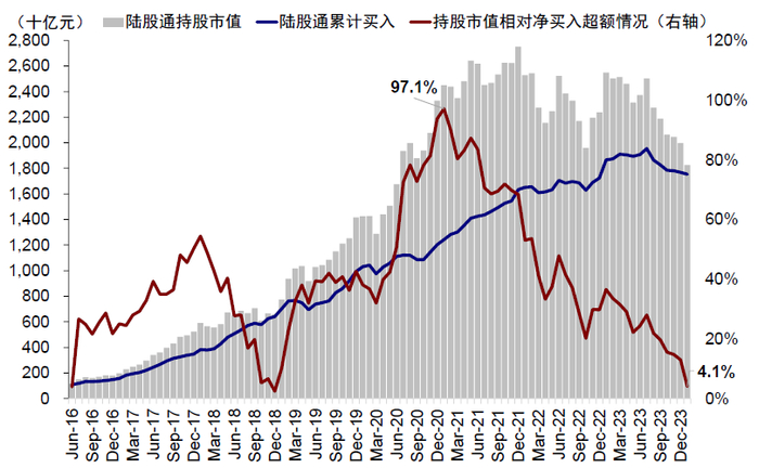 图表9:近年来A股市场表现不佳,陆股通持股市值与累积净买入金额已基本持平
