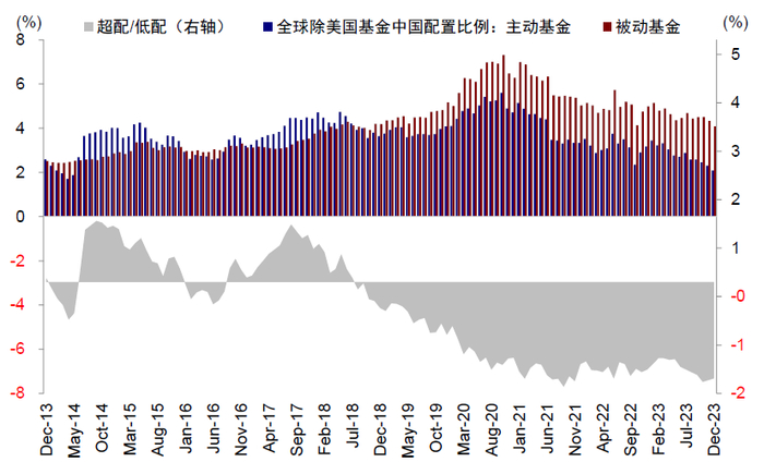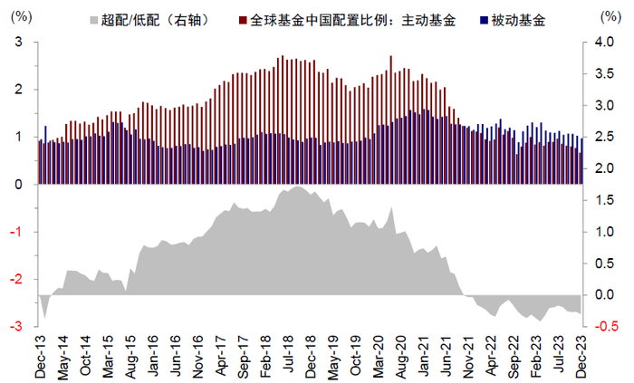 不过,相比绝对水平,我们认为相比基准的超/低配水平更有价值。截至去年12月,全球型基金(配置范围为全球的基金)已低配中资股0.3个百分点(基准比例0.98%,2018年以来最低时低配0.42%)。新兴市场基金低配中资股2.8%(基准比例25.2%,最低时低配6.8%)、全球除美国基金(低配2.0%,基准比例4.1%,最低时低配2.2%),亚洲除日本基金当前低配4.8%(基准比例28.1%,最低时低配6.7%)。