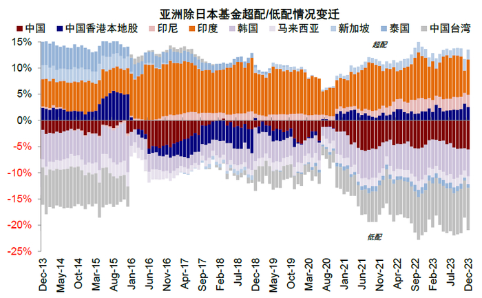 图表14:全球基金对中国、印度逐步从超配转向低配,韩国仍维持超配,日本低配有所下降