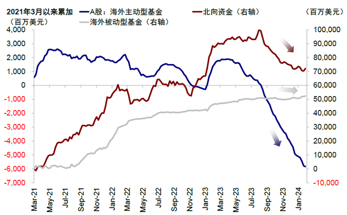 2023年8月以来,北向资金持续流出引发广泛关注,也成为加大市场波动的原因之一。如果观察刻画外资行为更准确的EPFR主动资金,其持续流出的时间更是已接近一年之久(2023年3月开始)。