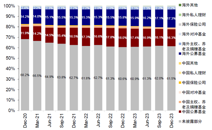 图表3:自下而上梳理MSCI中国指数权重前100个股的投资者结构