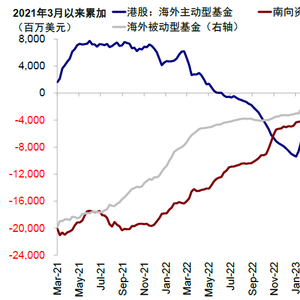 图表1:EPFR口径下海外主动资金自去年3月以来持续流出海外中资股市场,与南向背离