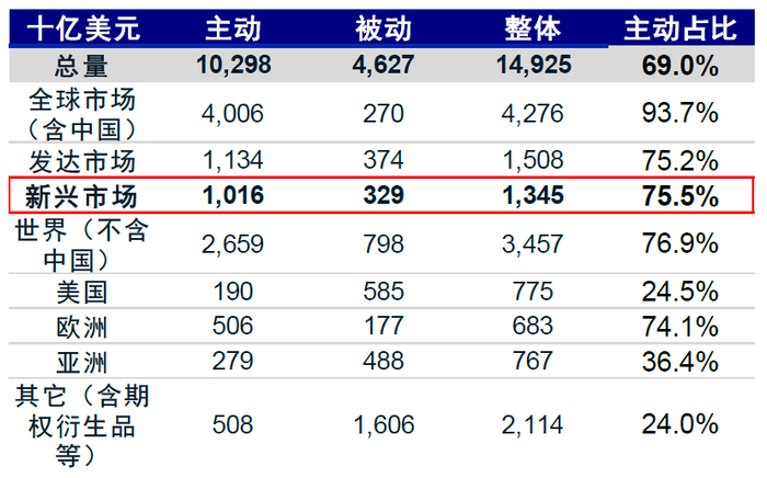 图表5:跟踪MSCI新兴市场指数(含中国)的基金中,主动基金占主导,约占75%,是被动资金的3倍